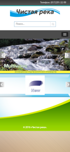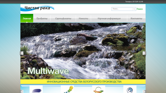 | AI-анализ | This website is the main page of "Чистая река" (Clean River) by the .BY domain name c-river.by. The title, description, and keywords for this page are all "Главная" (Main). Top words include "главная" (main), "продукты" (products), "сертификаты" (certificates), "новости" (news), "научная" (scientific), and "информация" (information), as well as "контакты" (contacts), "телефон" (telephone), "поиск" (search), and the words "prev" and "next" likely used for navigation. The page includes a phone number, (017)291-32-99, and mentions the year 2016. The footer |