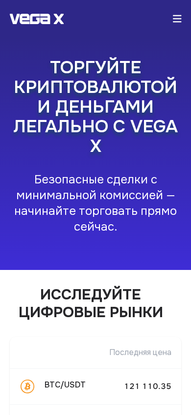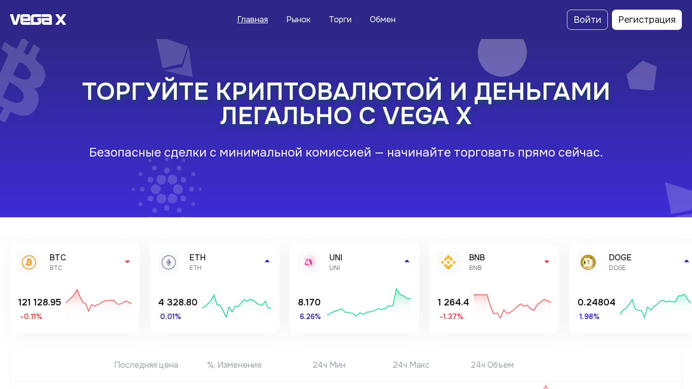 | SEO-описание | Криптовалютная биржа Vega X позволяет быстро покупать и продавать криптовалюту с минимальными комиссиями. |