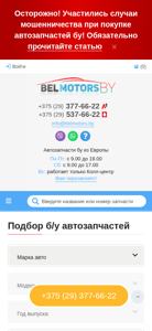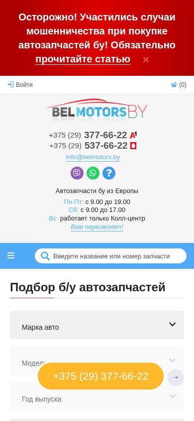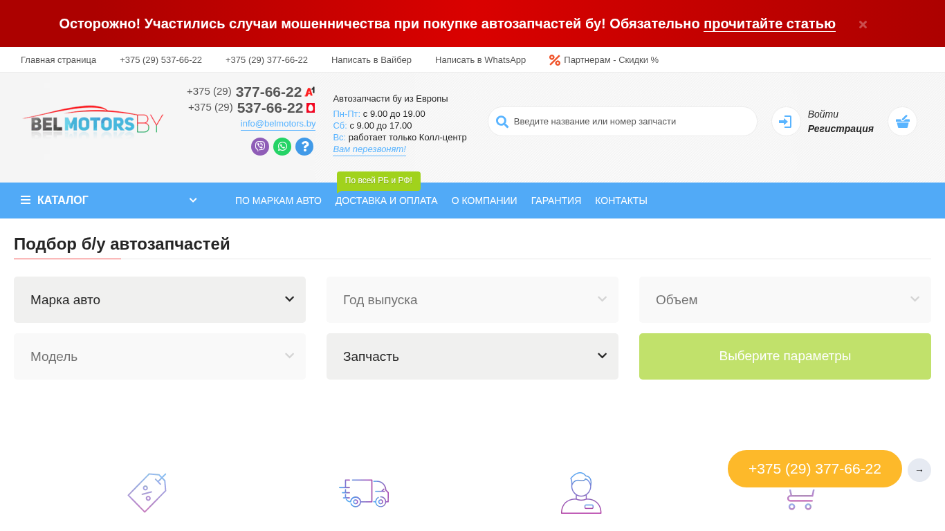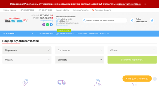 | AI-анализ | The website is an e-commerce platform for buying used auto parts from Europe, specifically in Minsk and Belarus. Belmotors.by offers 100% original used parts sourced directly from Europe without intermediaries. The company advertises itself as the first supplier of used parts from Europe in Belarus, with low prices. Users can contact the business via phone at +375 (29) 377-66-22 or +375 (29) 537-66-22, or through WhatsApp or Viber. The website features a catalog for various auto makes, including Alfa Romeo, Audi, BMW, and others, and offers delivery and payment throughout Belarus and Russia. The site is open for business Monday through Saturday from 9:00 AM to 7:00 PM and Sunday only |