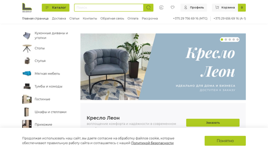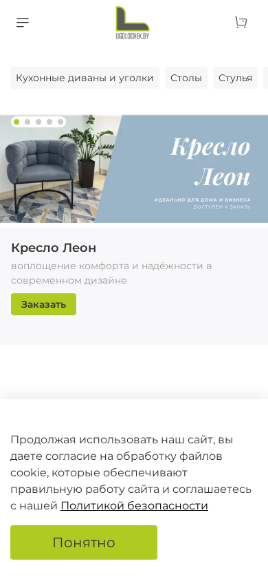 | AI-анализ | The website is an online furniture store named 'Уголочек' based in Minsk, Belarus. It features an official catalog displaying a wide range of furniture items for sale, along with their prices. Customers can buy furniture on credit and have it delivered across Belarus. The site also offers discounts and promotions on furniture. The catalog includes sections for kitchen divans and corners, stools, tables, chairs, sofas, wardrobes, and more. Users can browse through various brands such as Orimex, Glider, Sofos, Drevprom, Imperal, and Kuraz. The materials used for obi (upholstery) include synthetic leather, synthetic velour, velvet, and synthetic fur. Countertops are made of single-toned wood, stone, or marble. The site's main page includes options for delivery, contact information |