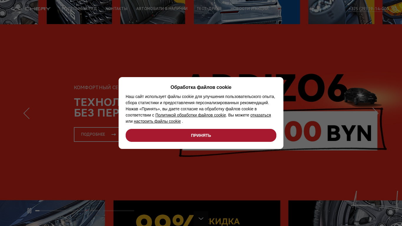 | SEO-описание | Автомобили Chery купить в Беларуси ✅ Официальный дилер машин Chery в Беларуси 🚘 У нас вы можете купить авто Chery в автосалоне 🔥 Новые модели китайских автомобилей Chery по выгодным ценам ✅ Записывайтесь на тест-драйв машин Чери! |