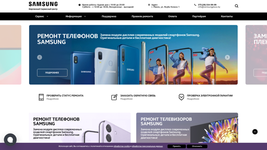 | AI-анализ | --- The web project "Samsung Service Center in Minsk" offers repair services for Samsung devices in Minsk, Belarus. The center provides repair in installment plans and guarantees repairs in the client's presence. The company's address is located at ul. Якуба Коласа 1 in Minsk, and their phone number is (29) 334-09-09. The website includes information about the company, ongoing actions, warranties, news, vacancies, support, and repair services for various Samsung devices such as Galaxy series, Note series, Flip/Fold series, televisions, and monitors. Users can select a device model, upload a file, and agree to the cookie and personal data processing policies to initiate a repair request. The website also provides information on services like screen panel replacement, battery replacement, and back cover replacement. |