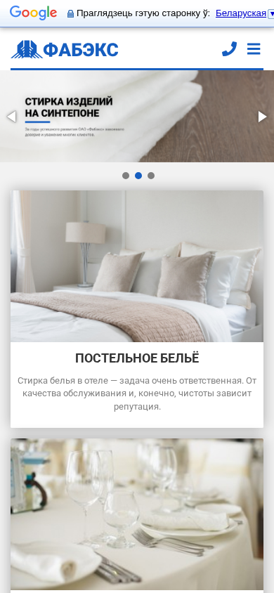 | AI-анализ | The website <http://fabex.by> is titled "ОАО «Фабэкс». Стирка и обработка белья" and is associated with the keywords "fabex, белья, оао, стирка, обработка, сертификаты, предприятии, обращения, постельное, столовое, медицинских, учреждений, одежда, синтепоне." The website offers laundry and processing services for bed linen, table linen, medical institution linen, special clothing, and items made of synthetic materials. The company, which has been in operation since 1972, boasts of 180 satisfied clients and 85% of them being budgetary organizations. The website also mentions that they employ professionals with a median work experience of |