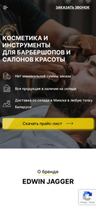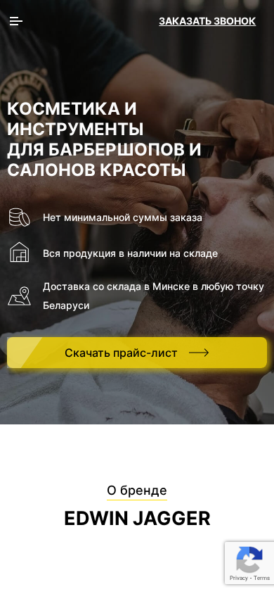 | AI-анализ | The portal Edwin Jagger is a premium cosmetics brand for barbershops in bulk. This brand offers advantages in the catalog, allowing customers to leave a request for delivery and payment, view photographs from the warehouse, and contact information. The street address is Ul. Petra Mstislavtsa, 18, with phone number +375(29) 686-77-66. The menu includes options for placing orders or requests for a call. This cosmetics and tool company for barbershops and beauty salons has no minimum order requirement and offers delivery from its Minsk warehouse throughout Belarus. A price list can be downloaded from the site. Edwin Jagger is a traditional English brand with a quality style combined with contemporary design and modern production technology. The company has set standards for men's grooming since 1988 and is |