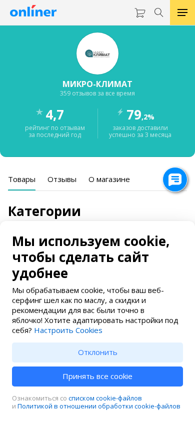 | AI-анализ | The web project "Купить товары в магазине МИКРО-КЛИМАТ" is an online store that offers a catalog of products for sale. The convenience of shopping online is emphasized, with features such as product specifications, photos, reviews, and price comparisons provided. The store sells a variety of items, including household appliances, building and repair materials, and goods for the home and garden. There are 3272 products available, with filters for delivery from specific locations and brands such as Samsung, LG, and Philips. The store has a delivery service from Onlíner, and offers super-pricing, delivery to Minsk, and the ability to filter by various criteria. There have been 359 reviews left, with an average rating of 4.7 out of 5 stars for the last year, and 79 |