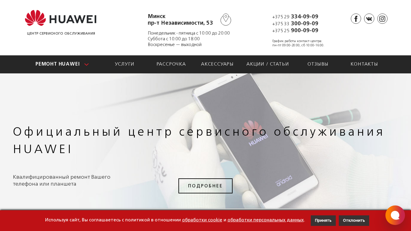 | SEO-описание | Авторизованный сервисный центр Huawei. Ремонт мобильных телефонов и планшетов. Оригинальные запчасти, выгодные цены, гарантия качества. Узнать стоимость ремонта. |