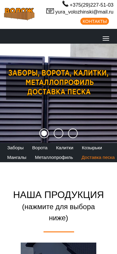 | AI-анализ | This website is for a metal fencing and gate supplier named Volozhinski in Belarus, with locations in Liaховичи and Baranovich. The business has been selling metal profiles, concrete fences, gates, and fence posts for over 20 years. Products include metal fences, metal gates, fence posts, metal roofs, and concrete fences. Clients can contact the company by phone or in person to place orders and inquire about delivery and pickup services. Additionally, the company offers the sale and delivery of sand. |