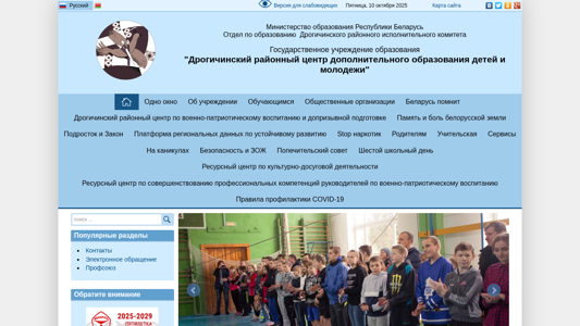 | AI-анализ | --- The portal cvr.drogichin.edu.by is the website of the Drohichyn District Center for Additional Education for Children and Youth. The site provides information on the educational institution, its activities, and various educational resources. Key topics include news, education, and health, with a focus on anti-drug and safety issues. The site includes sections on school days, public organizations, and regional development, as well as resources for teachers and parents. The site also features information on vaccination campaigns against the flu, with details on the location and availability of free vaccinations. The site is operated by the Ministry of Education of the Republic of Belarus and the Drohichyn District Executive Committee. The design is standard, with a medium font size, standard line spacing, and a light color scheme. Images are disabled, with text displayed in black on a white background. Additional features include a text- |