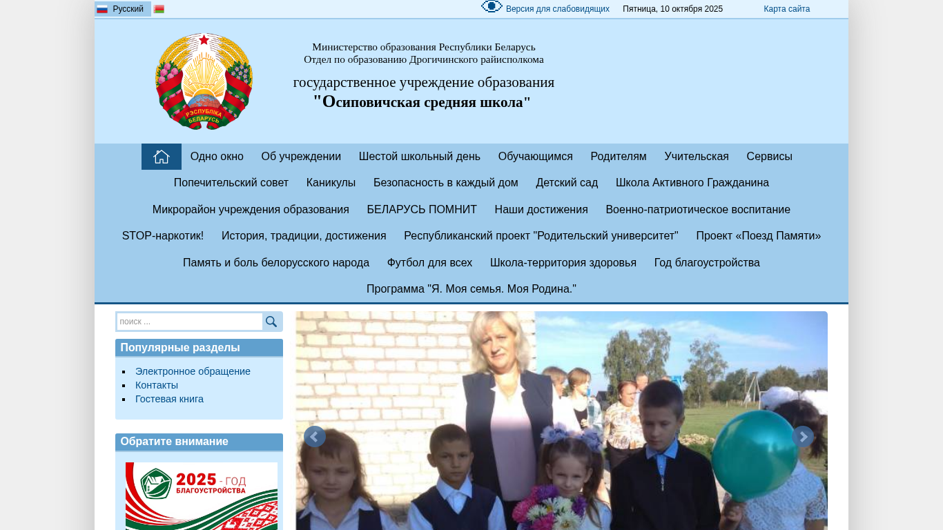 | AI-анализ | --- This website belongs to the state educational institution "Osiповичская средняя школа" (Osiпоvich Secondary School) in Belarus. The title of the website is "Осиповичская д/с- СШ" (Osiпоvich District School). The description section of the website contains information about the school day, services for parents and teachers, safety, kindergarten, active citizen school, and various projects and initiatives. Popular sections include electronic applications, contacts, and a guest book. The website is available in Russian and includes a banner and statistics on website visits. The administration of the website is indicated as the copyright holder. The domain is osipovichi.drogichin.edu.by. |