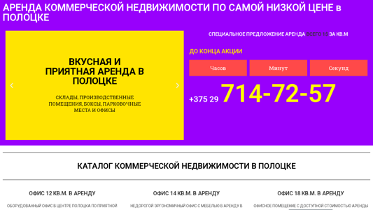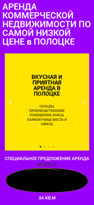 | SEO-описание | АРЕНДА КОММЕРЧЕСКАЯ НЕДВИЖИМОСТЬ ПО НИЗКОЙ ЦЕНЕ В ПОЛОЦКЕ. ОФИСЫ, СКЛАДЫ И ПРОИЗВОДСТВЕННЫЕ ПОМЕЩЕНИЯ ОТ 1$ ЗА КВ.М. ТЕЛЕФОН +375 (29) 714-72-57 |