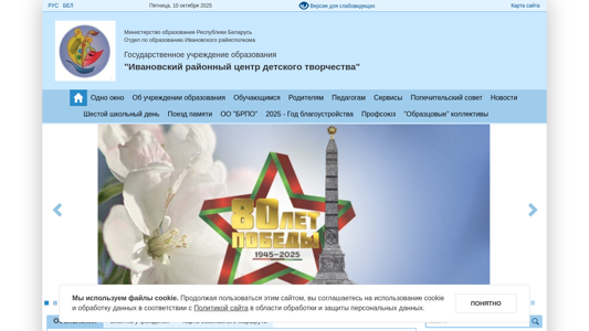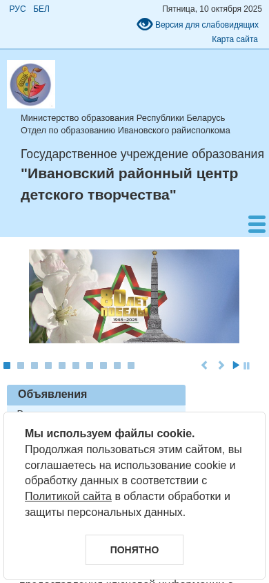 | AI-анализ | The web project "Ивановский районный центр детского творчества" (Ivanovo District Children's Creative Centre) is a Belarusian educational website. The domain name is "rcdt.ivanovo.edu.by". The title of the website is "Ивановский районный центр детского творчества" (Ivanovo District Children's Creative Centre). The keywords include words like "information", "our", "circles", "more", "read", "further", "ours", "education", "news", "Belarus", "créole", "latvian", "map", "republic", "rcdt", "ivanovo", and "edu". The top words on the website are "2025", "information", "our", "circles", "more", "read", "further", |