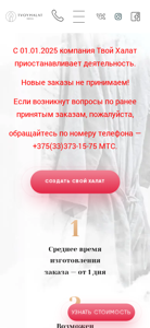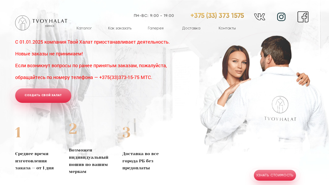 This website is an e-commerce platform selling named robes with embroidery for adults and children. It offers high-quality products at affordable prices and delivers throughout Belarus. The catalog includes various types of robes, such as velour, plush, and mahrove ones, as well as plain domestic ones without embroidery. Custom-made orders with individual measurements are also available. The average production time for an order is one day, and delivery is free throughout Belarus without prepayment. The company, Tvoj Halat, will cease operations from January 1, 2025, and will no longer accept new orders. Existing orders and inquiries can be addressed by phone at +375(33)373-15-75. The website also provides a section for creating personalized robes and offers various discounts, including