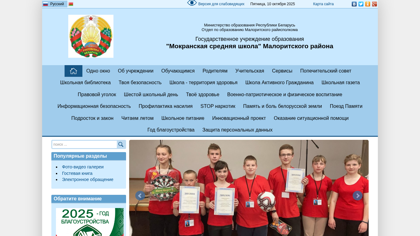 | AI-анализ | --- The website "Мокранская СШ" (Mokranская SSh) is the official website of a middle school located in the Malorita district of Belarus. The title and description include the name of the school and the words "middle school," "education," and "school." Popular keywords include "read," "news," "school," and "video." The website contains sections for "About the School," "Services for Teachers," "School Council," and "School Library," among others. The color scheme is standard with a medium font size and standard line spacing. Images are disabled and the color scheme is black and white. The website includes sections on school safety, health, military-patriotic and physical education, information security, and anti-drug and anti-violence initiatives. A blog, contact information, and a news section are also present. The website is accessible |