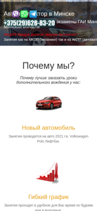 | AI-анализ | The website is dedicated to providing additional driving lessons in Minsk, Belarus. The title is "Автоинструктор - дополнительные уроки вождения," and the description includes keywords such as "дополнительные уроки вождения," "Автоинструктор," and "Минск." The top words indicate a focus on driving lessons, Minsk, and the auto instructor. The website offers driving lessons in Minsk and the surrounding area, and provides cars for driving tests at the GAI (State Automobile Inspectorate). It also mentions a sale or discount on every tenth lesson. The website includes information about the benefits of learning to drive with them, such as the use of a new car model, a flexible schedule, and personalized instruction. The website also offers various services including test preparation, skill enhancement, and route practice. Users can request |