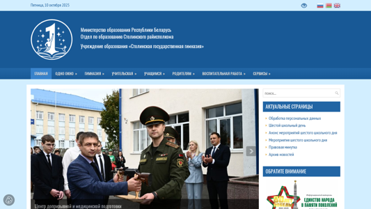 | AI-анализ | This online resource represents the official website of Stolin State Gymnasium, located in Belarus. The site provides information about the institution, its administration, academic programs, and various activities. The title of the site is "Столинская государственная гимназия" and it includes sections on the school's history and traditions, educational offerings, administrative procedures, and contact information. Keywords associated with the site include "gymnasia," "education," "work," and "Belarus." The site also features sections on safety, student council, and extracurricular activities. The domain name is gim.roo-stolin.gov.by. |
