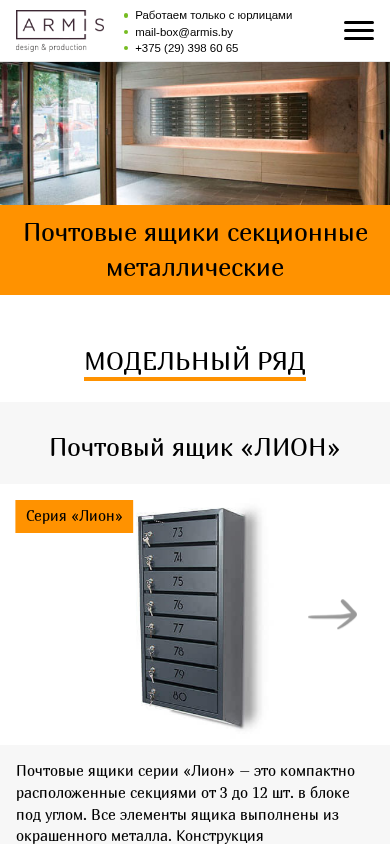 | AI-анализ | --- This online resource offers the sale of metal sectional mailboxes for apartment buildings at a low price. The anti-vandal metal mailboxes come in a variety of sizes from 3 to 12 sections. Delivery is available. Keywords: mailboxes, metal, anti-vandal, for apartment building entrance, sectional Top words: steel 12, mailboxes 11, postal 10, thickness 10, sections 10, doors 7, quantity 7, postbox 6, box 6, fittings 6, arkadas 6, series 5, series 5, located 5, produced 5, characteristics 5, material 5, products 5 The website features mailboxes from the "Lion" and "Arkada" series. The Lion series consists of compact sectional mailboxes with |
