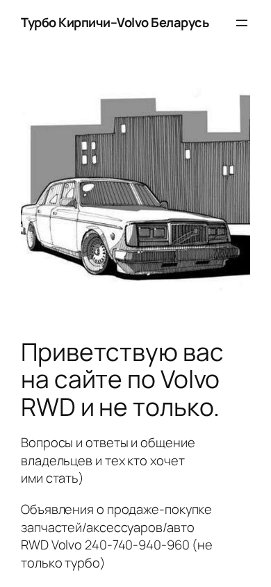| SEO-описание | Вопросы и ответы и общение владельцев и тех кто хочет ими стать) Объявления о продаже-покупке запчастей/аксессуаров/авто RWD Volvo 240-740-940-960 (не только турбо) Всё общение происходит в группе телеграм «Турбо Кирпичи–Volvo Беларусь» https://t.me/+9fH0pAxzr2EwNjQy |