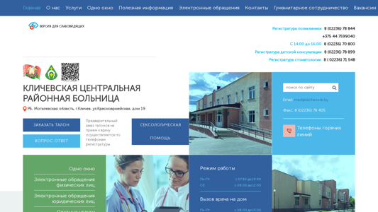 | AI-анализ | The web project "УЗ Кличевская ЦРБ | Главная" is a Belarusian healthcare facility website with a focus on providing information about the clinic's services, schedule, and contacts. The title of the page is "УЗ Кличевская ЦРБ | Главная" (Klichevskaya TSRB | Main). The description field is empty. The keywords include "црб" (hospital), "услуги" (services), "кличевская" (Klichevskaya), and "обращения" (applications). The top_words list shows that the site contains information about the clinic's services, schedule, registration, electronic services, and various medical procedures, including consultations, laboratory tests, and ultrasounds. The site also has sections for administrative procedures, news, and FAQs. |