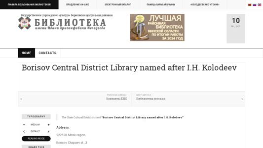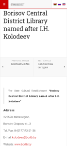 | SEO-описание | ГОСУДАРСТВЕННОЕ УЧРЕЖДЕНИЕ КУЛЬТУРЫ «БОРИСОВСКАЯ ЦЕНТРАЛЬНАЯ РАЙОННАЯ БИБЛИОТЕКА ИМ.И.Х.КОЛОДЕЕВА» |