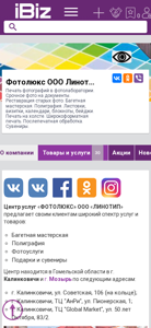 | AI-анализ | This website is a photography and printing service based in Kalinkovichi, Belarus. The business, named Фотолюкс ООО Линотип, offers photo printing in a lab, urgent photo printing on documents, photo restoration, and a bakery. It also provides polygraphic services, including the production of flyers, business cards, calendars, notebooks, badges, and printing on canvas and large formats. The website includes a map with contact information for the company at 247693, Советская, 106 in Kalinkovichi. Additionally, the site features free classified ads for buying and selling items. |