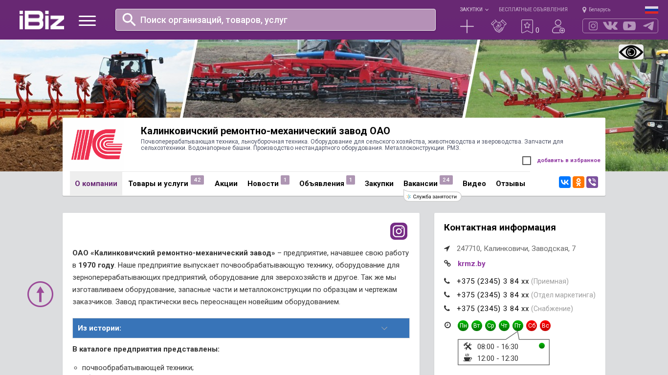 | Название / Заголовок | Калинковичский ремонтно-механический завод ОАО - Почвоперерабатывающая техника, льноуборочная техника. Оборудование для сельского хозяйства, животноводства и звероводства. Запчасти для сельхозтехники. Водонапорные башни. Производство нестандартного оборудования. Металлоконструкции. РМЗ.. 247710, Калинковичи, , Заводская, 7 |