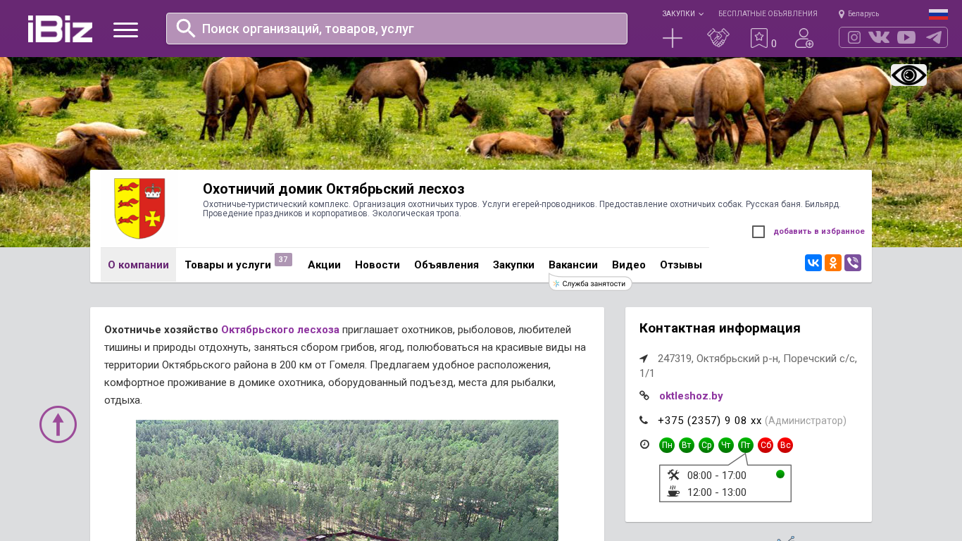 | Название / Заголовок | Охотничий домик Октябрьский лесхоз - Охотничье-туристический комплекс. Организация охотничьих туров. Услуги егерей-проводников. Предоставление охотничьих собак. Русская баня. Бильярд. Проведение праздников и корпоративов. Экологическая тропа.. 247319, , Поречский c/c, 1/1 |