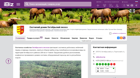 | AI-анализ | This online resource is a hunting lodge and tourist complex called Охотничий домик Октябрьский лесхоз. The website provides information on organized hunting tours, services of hunting guides, and the availability of hunting dogs. The complex offers a Russian banya, billiards, and event organization for parties and corporate events. An ecological trail is also available. The company's contact information, including its location at 247319, , Поречский c/c, 1/1, is provided. The website offers various hunting and recreational services, including arranging visas, permits for weapons, airport transfers, and car rentals for hunting. The hunting lodge accommodates six people and includes a comfortable living room, billiards, a real Russian banya, and internet access on the property. Hunting opportunities include various game animals, |