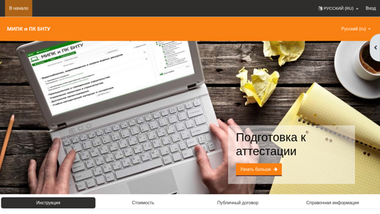 | AI-анализ | --- The portal is an educational site for MIPK and PK BNTU, which offers a round-the-clock service for exam preparation. Access to the site requires filling out an application, receiving an invoice, login and password to the educational site fsn.mipk.by, and making a payment. For physical individuals, registration and self-access to the desired exam preparation course are also required after payment. The courses are available in the ERIP catalog under 'Education and Development' > 'Additional Education and Development' > 'Professional Education' > 'Minsk' > 'BNTU MIPKiPK' > 'Consultation Services'. Payment can be made online using a bank card. |