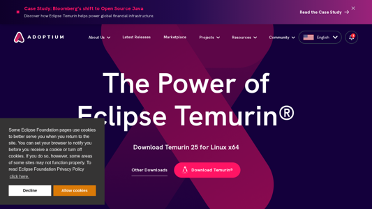 | AI-анализ | The portal Adoptium is a website dedicated to providing prebuilt OpenJDK binaries from a fully open source set of build scripts and infrastructure by Eclipse Foundation. The website offers high-performance, cross-platform, open source Java Runtimes that are enterprise-ready and Java SE TCK certified and AQAvit verified for general use in the Java ecosystem. The site also provides information on the latest releases, news, and resources for the community. Visitors can download Temurin, a trusted open source JDK, and join the Eclipse Temurin Sustainer Program to support the project. The site uses cookies and offers a case study on how Bloomberg shifted to Open Source Java using Eclipse Temurin. |