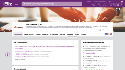 | AI-анализ | language: ru This website is a production company for MAz-Veychai OOO, which specializes in the import and assembly of various diesel engine models, including WP5, WP7, WP12, WP3, and WP7. These engines are imported in either completely disassembled (CKD) or semi-disassembled (SKD) form for the manufacturing of trucks, buses, and construction equipment. The company is located in the Chinese-Belarusian Industrial Park 'Velikii Kamne', in Smolevichy District, Minsk, Belarus. The contact information, including phone numbers and address, are provided on the website. The company's UNP number is 691700321. The website also includes a map and information on opening hours. |