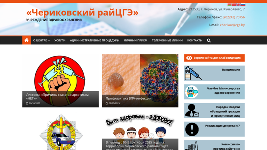 | AI-анализ | This website is for the "Чериковский райЦГЭ" (Cherikovsky raytsyaghe), a health institution located in Cherikov, Belarus. The website provides information on the center's structure, vacancies, documents, services, administrative procedures, personal reception, telephone lines, contacts, news, and various health topics such as healthy cities and lifestyles, disease prevention, and epidemiology. The website also features an electronic chat-bot for health-related inquiries and information on how to file electronic requests. The center focuses on promoting healthy living, disease prevention, and providing various health services. The website is accessible for visually impaired individuals and offers information on vaccination, commission against corruption, and quality of services. The domain name is cherikov.cge.by. |