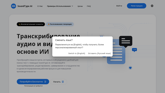 | AI-анализ | The website SoundType AI is an AI-powered platform for audio and video transcription. Users can upload their audio or video files to the platform and the system, utilizing advanced AI technology, transcribes the content into text. The website offers quick and accurate transcription results, along with the ability to generate summaries and interact with the audio content directly through an integrated chat function. The platform caters to various formats and is suitable for a wide range of content, from lectures to interviews. |