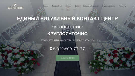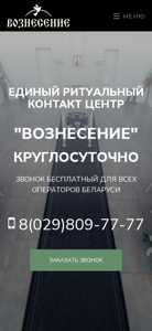 | AI-анализ | This online resource is a funeral home and memorial center called "Edinyy Ritual'nyy Kontakt Centr" (Single Ritual Contact Center) located in Mozyr, Belarus. The website offers funeral services, including a funeral hall for farewell ceremonies, ritual services in various cities in the Homiel region, and a ritual shop for purchasing necessary items. The funeral home provides caring service, suitable decoration, and comfortable arrangement for conducting a respectful and dignified farewell to the deceased. The contact information includes a free phone number for Belarusian operators and an address in Mozyr on Gagarina Street. The funeral services include ritual assistance in selecting items, organizing the necessary steps such as the funeral, farewell ceremony, and memorial feast. The funeral home also offers a graveyard service, a ritual agent service, and a ritual shop selling items such as graves |