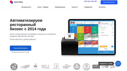 | AI-анализ | The web project Quick Resto BY is a program for automated management of cafes, restaurants, bars, and coffee shops, including food trucks or catering services, with an online inventory system and a cash register on a tablet. Quick Resto offers comprehensive accounting features, CRM, and customizable reporting. The system includes a free trial period of 14 days, with support available via phone, Instagram, Viber, Telegram, and email. Key features include a user-friendly interface, easy management of orders by waitstaff and cashiers, order customization with add-ons, soups, and degrees of doneness, various payment methods, discounts, and loyalty programs. The cash register terminal allows users to create orders, apply discounts, authorize customers, and process payments in cash or with loyalty points. The terminal's interface is mostly automated, with on-screen prompts for less common tasks. The system also |