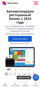 | SEO-описание | Quick Resto – автоматизация ресторана, кафе, кофейни, бара, кофейни фудтрака или столовой под ключ. Программа для полноценного складского учёта в общепите онлайн, удобный кассовый терминал на планшете, CRM и настраиваемая система отчетов. |