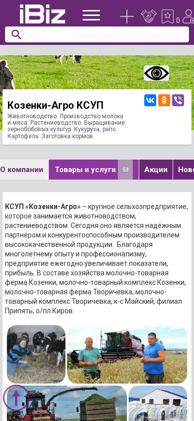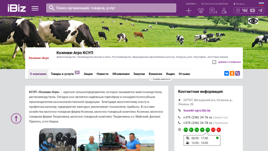 | AI-анализ | The website Kozenki-Agro KSUP is a large agricultural enterprise specializing in livestock farming, milk and meat production, crop farming, and cultivation of legume crops such as corn, rapeseed, and potatoes for fodder. The company, which is a reliable partner and competitive producer of high-quality products, has been in operation for many years and boasts a team of experienced professionals. Its holdings include the dairy farms Kozenki and Tvorichevka, the dairy complexes Kozenki and Tvorichevka, the farm KS May and the Pripyat filial, and the trading company Kirov. Kozenki-Agro KSUP produces and grows milk, pork, beef, grains, rapeseed, potatoes, and corn. The enterprise places great emphasis on product quality and offers individualized pricing and customer service. It has |