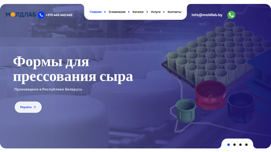 | AI-анализ | language: ru ---  This website is the homepage of Moldlab, a Belarusian company specializing in the production and services related to plastic forms for cheese making. The title is simply "Главная" (Main) and the description is blank. Keywords include "форм" (forms), "главная" (main), "сыра" (cheese), and various numbers. The top words are "форм" (forms) with nine occurrences, "главная" (main) with seven, and "сыра" (cheese) with seven. The website contains information about the company, a catalog of their products and services, and contact details. The company produces forms for both soft and hard cheeses, and offers services for extending the life of existing forms and creating custom forms. The company also manufactures other plastic products. The website is produced in Belarus |