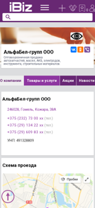 | AI-анализ | The website is an e-commerce platform for AlphaBel-gрупп OOO, a company based in Gomel, Belarus, selling automotive parts and accessories, lubricants, batteries, electrodes, tools, and construction materials. The website provides a scheme for reaching the company, contact information with three phone numbers, and business hours from Monday to Friday, 9:00 AM to 6:00 PM, with weekends being closed. The website offers various categories of products and services, including autozapchasti and prizhlionnosti (automotive parts and accessories), as well as Aktsii (deals or discounts), Novostei (news), and Ob'yavleniya (announcements or classifieds). Users can add items to their favorites and view company information, contacts, and ratings. The website also includes a map for finding the company's |