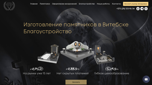 | AI-анализ | The web project <Памятник на могилу в Витеbске - diabaz.by> offers custom production and sale of granite gravestones: catalog, prices, photos. Affordable options are available for vertical and horizontal models. For more details, call +7 (925) 097-18-18. The business has been active in Vitsebske for 15 years, with no hidden fees and flexible pricing. Services include vertical and horizontal gravestones, memorial complexes, vertical rezned and gravened monuments, and various other decorative elements such as metal crosses, photo-ceramics, vases, lamps, and granite curbs. Additionally, they offer the installation of benches, fences, and borders. The company specializes in the production and installation of various types of monuments, including Armenian and Muslim |