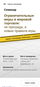 | AI-анализ | This website is for a seminar titled "Limiting Measures in Global Trade: Not a Barrier, But New Rules of the Game — Seminar of Belarusian Chamber of Commerce and Industry" held in Minsk, Belarus on June 13, 2025. The website provides information about the seminar, including its date, time, location, organizers, speakers, and registration process. Users can submit a request to register for the seminar by providing their company UNP (Unified State Register of Legal Entities and Individual Entrepreneurs) number, company name, position, contact information, and preferred registration level. The website also includes a section for attendees to submit questions to the speakers, as well as information about the seminar's program, conditions of participation, partners, and a public contract. Users can also download the seminar program. The organizers of the seminar are |