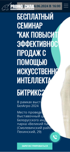 | AI-анализ | This website is an announcement for a free seminar titled "How to Increase Sales Effectiveness with Artificial Intelligence in Bitrix24" organized by OOO PromoSila. The seminar is part of the BelAgro-2024 exhibition and will take place at the Chinese-Belarusian Industrial Park "Great Stone," on June 4, 2024, from 16:00 to 17:00. The seminar is intended for business owners, top managers, and sales specialists who want to effectively utilize human resources, manage processes, and compete in a rapidly changing economic environment. Attendees can register for the seminar on the website and will learn how to streamline communications and operations across all company departments in a unified digital workspace, set up control and reporting systems for completed tasks, and evaluate the effectiveness of teams and individual employees. The seminar will |