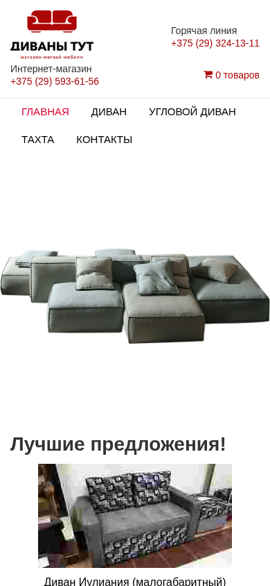 | AI-анализ | ---  This online resource, titled "Лучшие предложения! | Диваны тут" (Best Offers! | Divans Here), is a Belarusian e-commerce website specializing in the sale of sofas and armchairs, with the domain name divanytut.by. The website offers various types of sofas, including corner sofas, small sofas, and kitchen sofas, all from the brand 'Иулиания' (Iuliania). The prices range from 700,000.00 BYN to 3,400,000.00 BYN. The website also provides information on delivery, a contact number for a hotline, and a guarantee of up to two years on all models. The website promises high-quality furniture with reliable components and materials, as well as quick delivery from 9 |