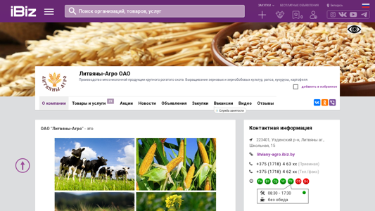 | AI-анализ | --- This website is for Litviany-Agro OAO, a Belarusian agricultural company specializing in meat and dairy production of large livestock, as well as cultivation of grains, legumes, rapeseed, corn, and potatoes. The company's location, contact details, and business hours are provided, along with sections for company information, products and services, news, job openings, and contact information for the editorial team. |
