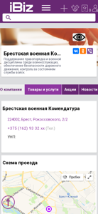 | Название / Заголовок | Брестская военная Комендатура - Поддержание правопорядка и военной дисциплины среди военнослужащих, обеспечение безопасности дорожного движения, контроль за состоянием службы войск.. 224002, Брест, , Рокоссовского, 2/2 |