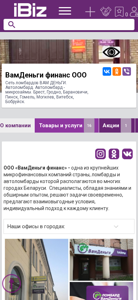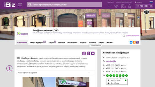 | AI-анализ | This online resource is a financial company named ВамДеньги финанс ООО (VamDengi Finans OOO) with a network of loan offices (ломбарды) and auto loan offices (автоломбарды) located in various cities in Belarus, including Brest, Grodno, Baranovichi, Pinsk, Homel, Mogilev, and Bobruisk. The company's offices in Brest are located on ul. Halturina d.31 "А" and ul. Sovietskaya 49 (2nd floor, entrance m-n ZIKO). The phone numbers for the Brest offices are (0162) 21-35-00, (29) 755-20-50, and (29) 193- |