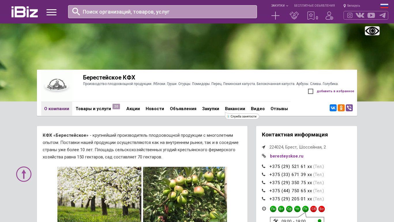 Название / Заголовок | Берестейское КФХ - Производство плодоовощной продукции. Яблоки. Груши. Огурцы. Помидоры. Перец. Пекинская капуста. Белокочанная капуста. Арбузы. Сливы. Голубика.. 224024, Брест, , Шоссейная, 2 |