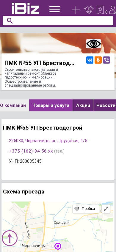 Название / Заголовок | ПМК №55 УП Брестводстрой - Строительство, эксплуатация и капитальный ремонт объектов гидротехники и мелиорации. Общестроительные и специализированные работы.. 225030, , Чернавчицы аг., Трудовая, 1/5 |