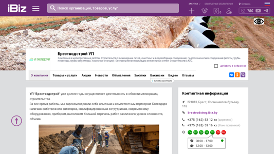 Название / Заголовок | Брестводстрой УП - Земляные и мелиоративные работы. Строительство инженерных сетей, очистных и водозаборных сооружений, гидротехнических сооружений (мосты, трубы-переезды, грубы-регуляторы, насосные станции). Бестраншейная прокладка инженерных сетей. Строительство АЗС.. 224013, Брест, , Космонавтов бульвар, 118 |