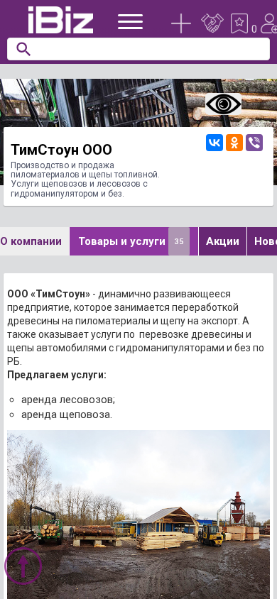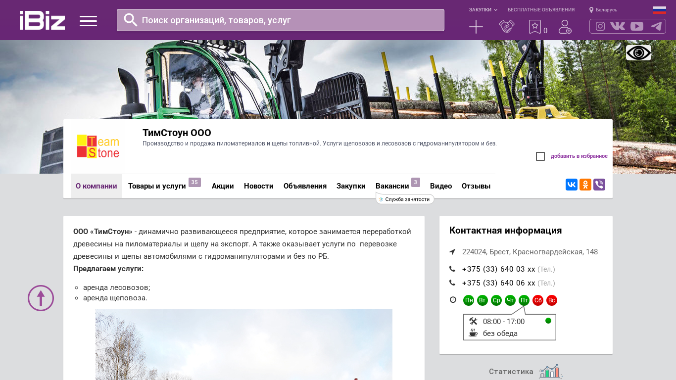 Название / Заголовок | ТимСтоун ООО - Производство и продажа пиломатериалов и щепы топливной. Услуги щеповозов и лесовозов с гидроманипулятором и без.. 224024, Брест, , Красногвардейская, 148 |