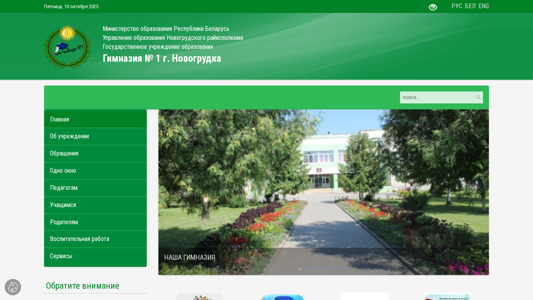 | AI-анализ | The web project "Gymnasium No. 1 in Novogrudok" is a Belarusian educational institution's website. The title of the page is "Гимназия № 1 г. Новогрудка" (Gymnasium No. 1 in Novogrudok). The description tag includes keywords related to education, school, and the city of Novogrudok. The top words indicate that the website mentions the dates October 10, 2025, and September 1, 2025/2026, as well as information about a first bell ceremony for first and fifth graders, a key to knowledge, and a school named "Gymnasia - School of the World." The site also features functional literacy, the sixth school day, a football club, military-patriotic education, and safety rules. There |